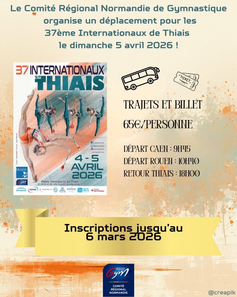 Le Comité Régional Normandie de Gymnastique vous propose un déplacement à Thiais à l’occasion des 37ᵉ Internationaux de Thiais, le dimanche 5 avril 2026.